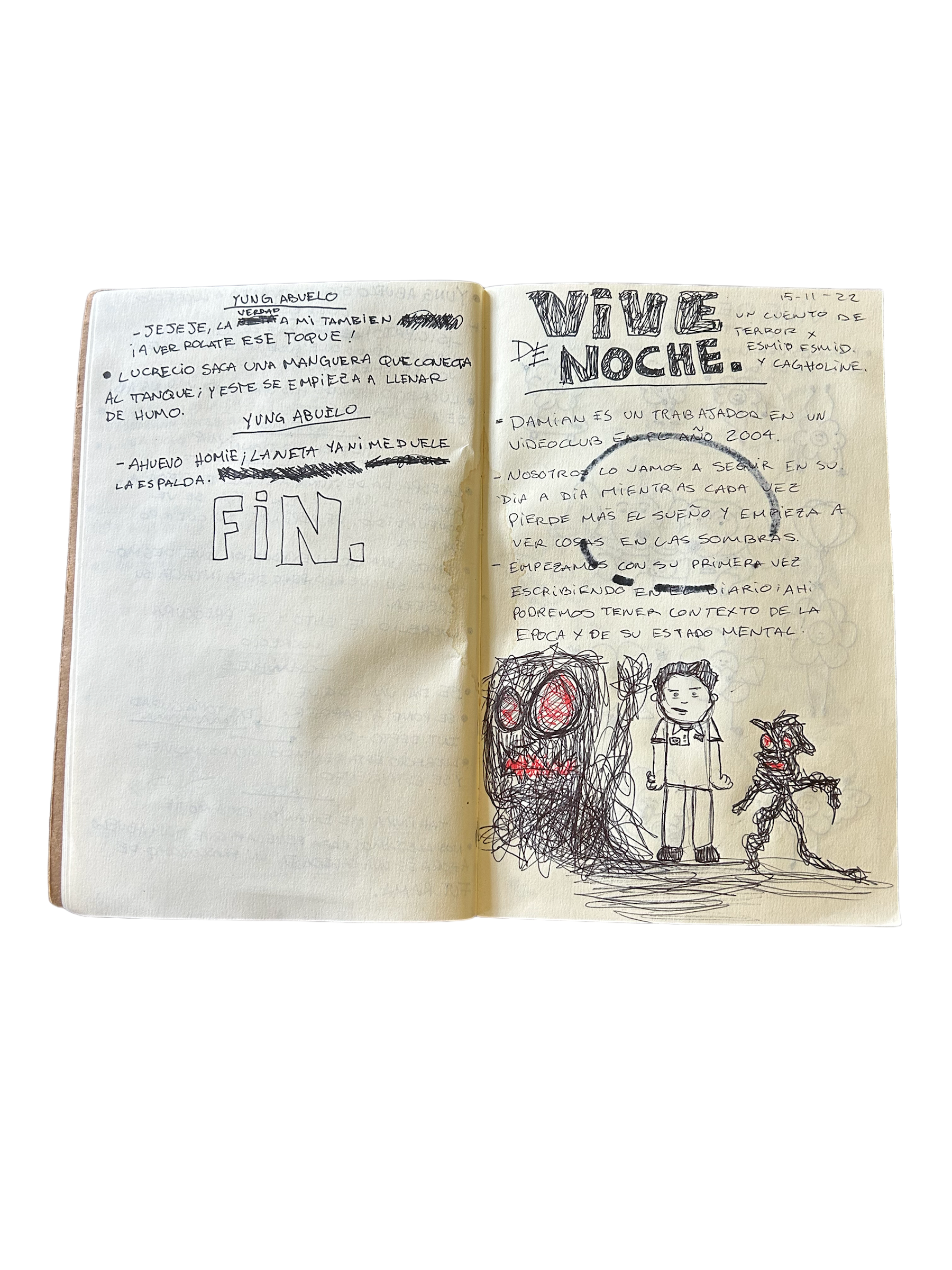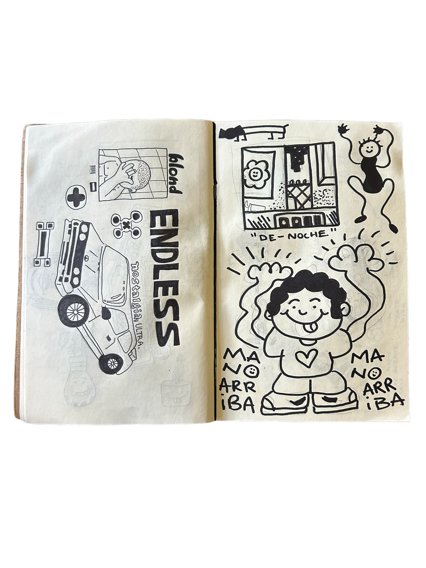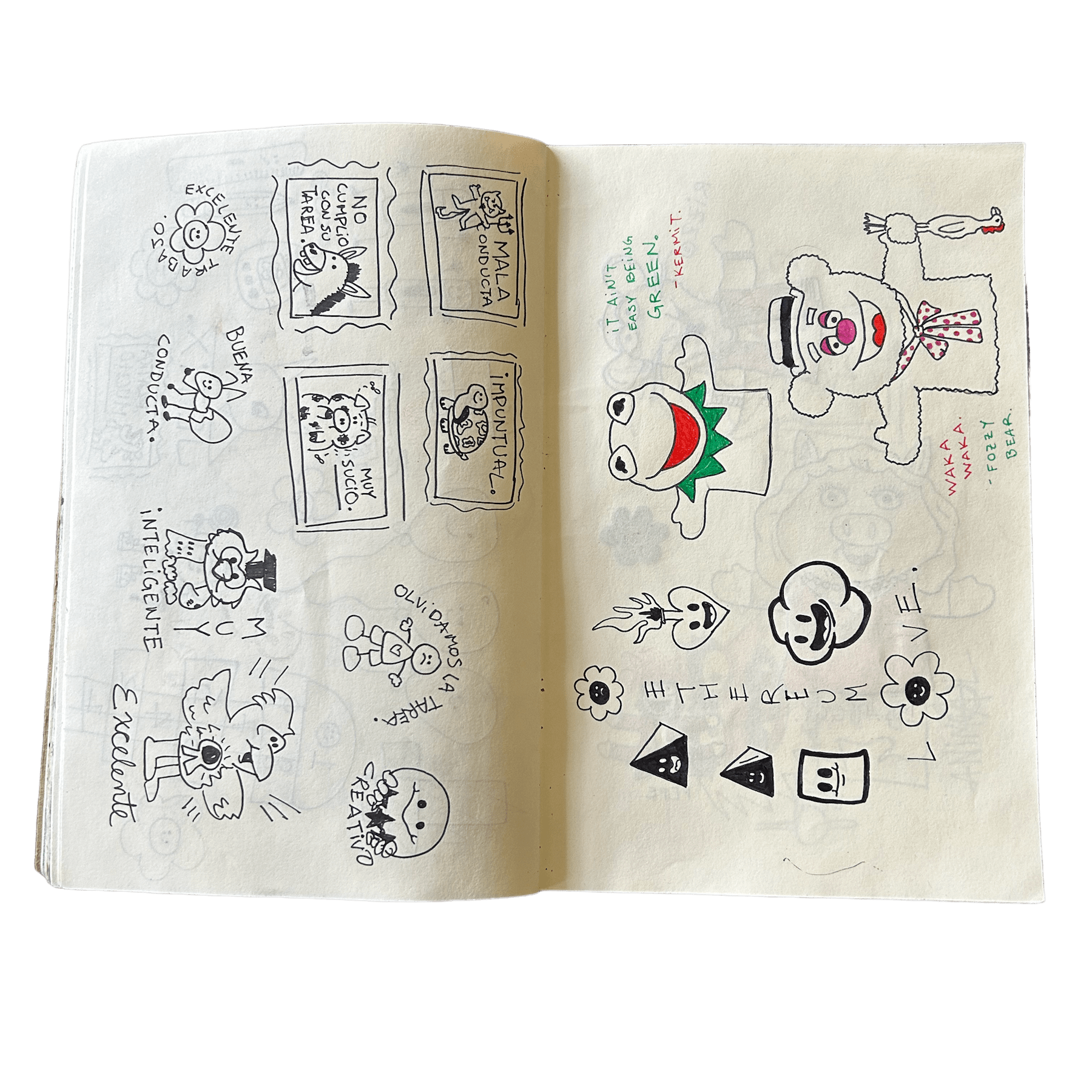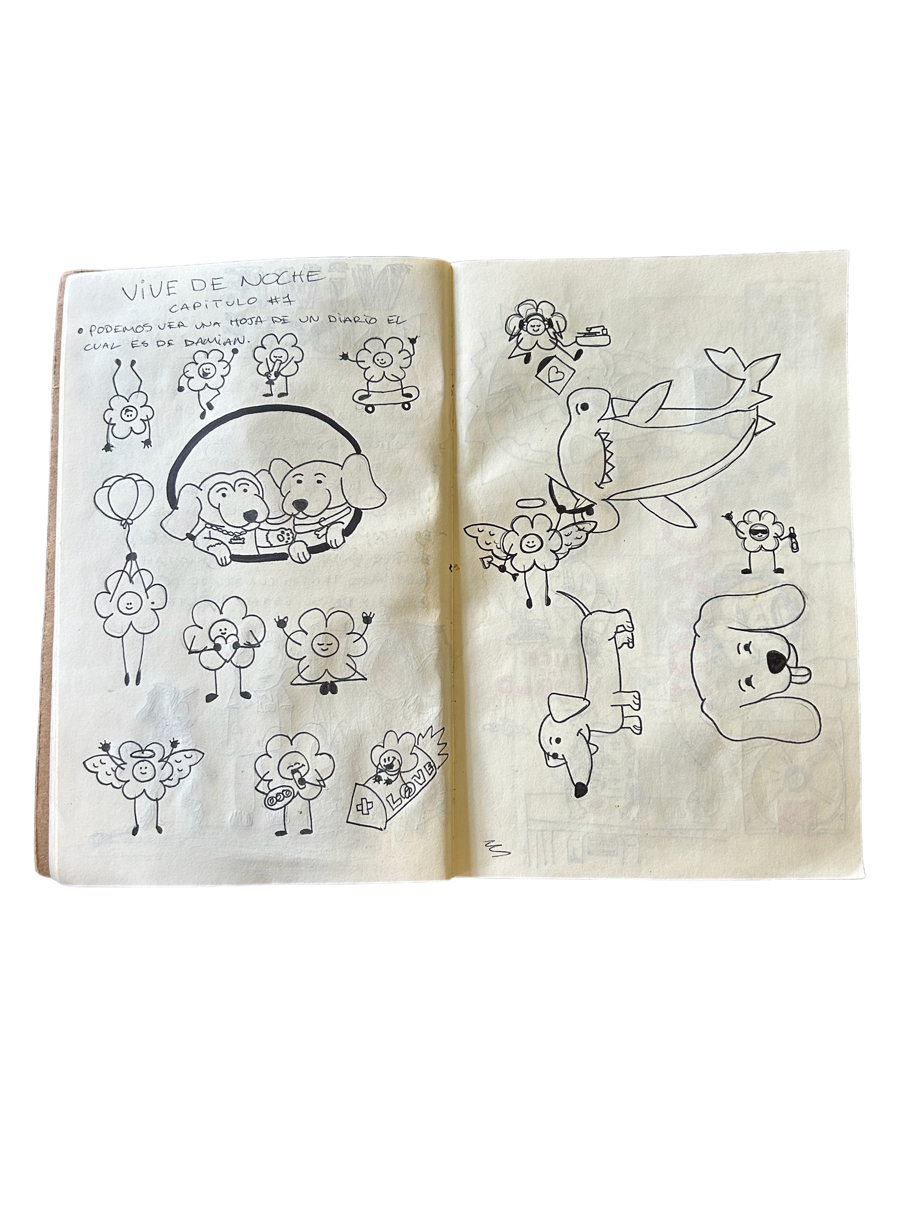 «CUADERNO DE DIBUJO EXTRA GRANDE PARA VIDEO MUSICAL DE DIBUJANDO» – Acrílico, Plumón y Pluma en papel y cartón -2023