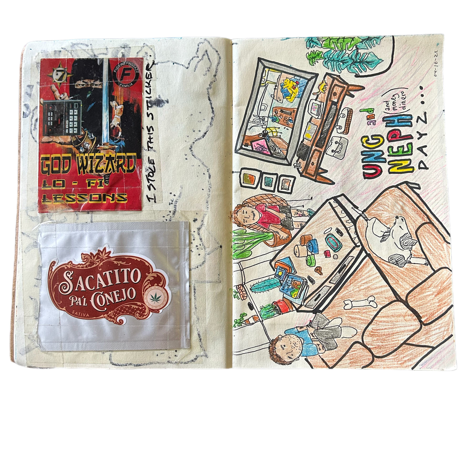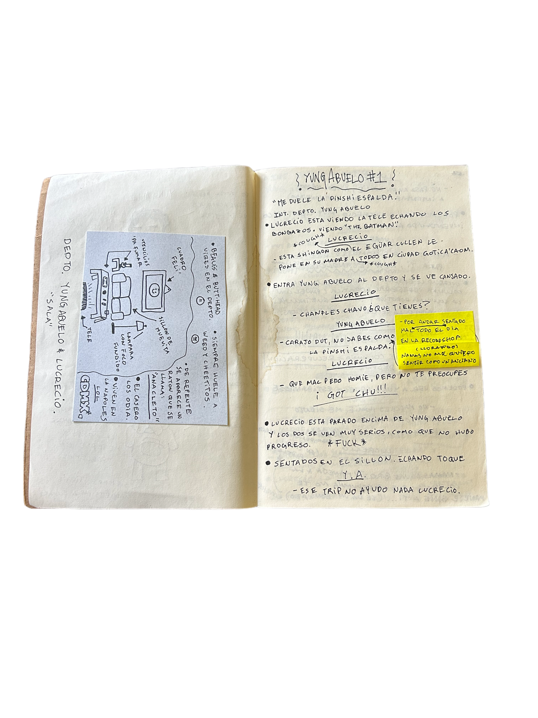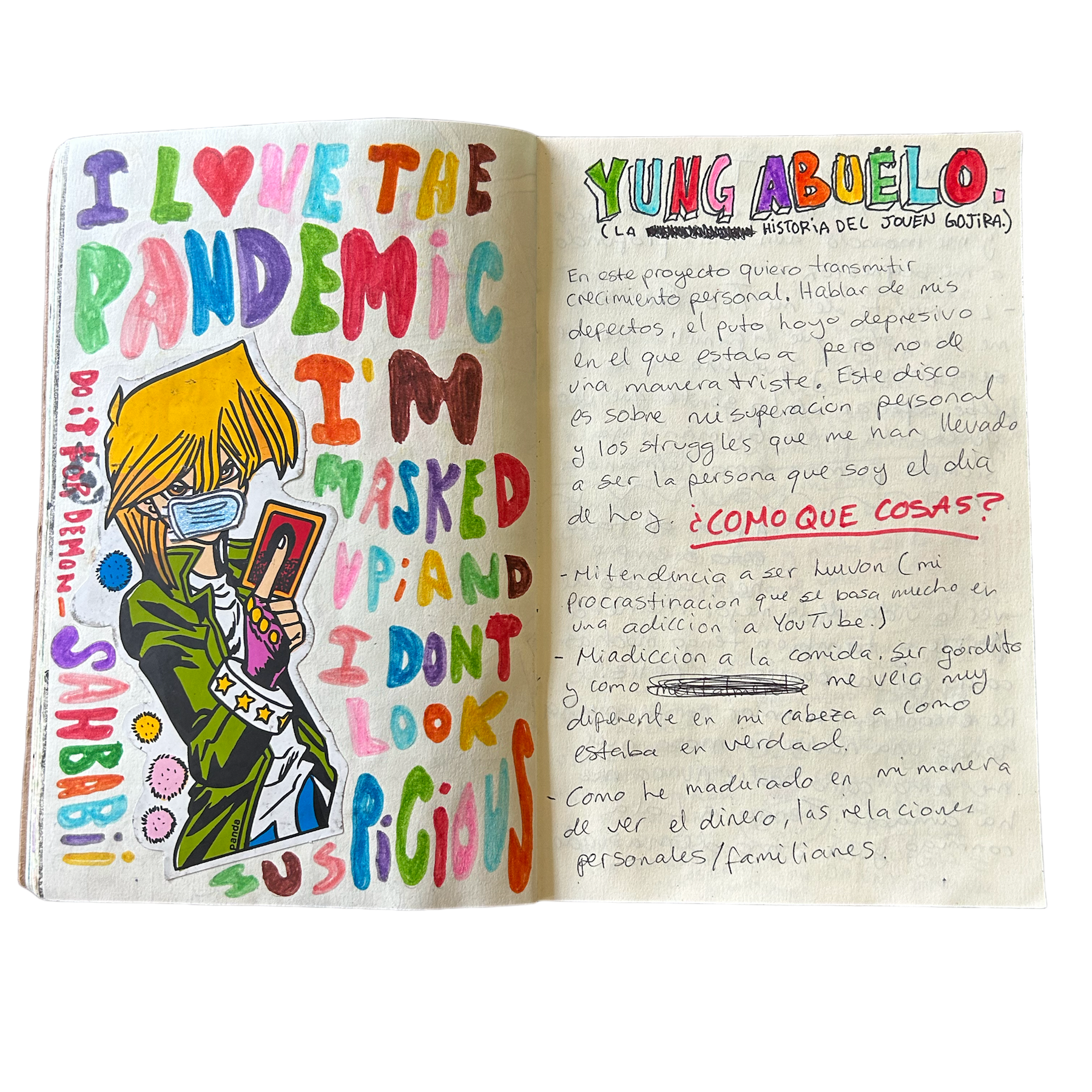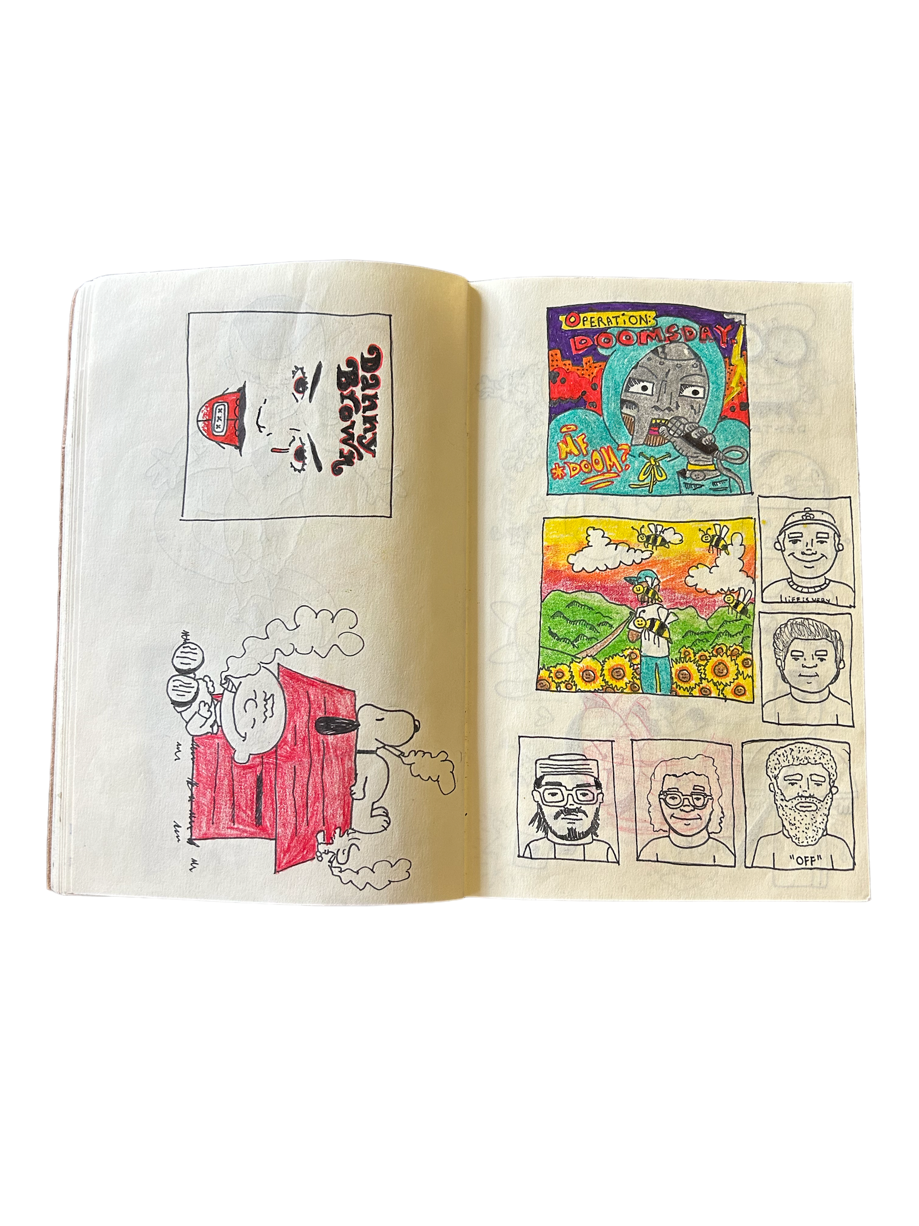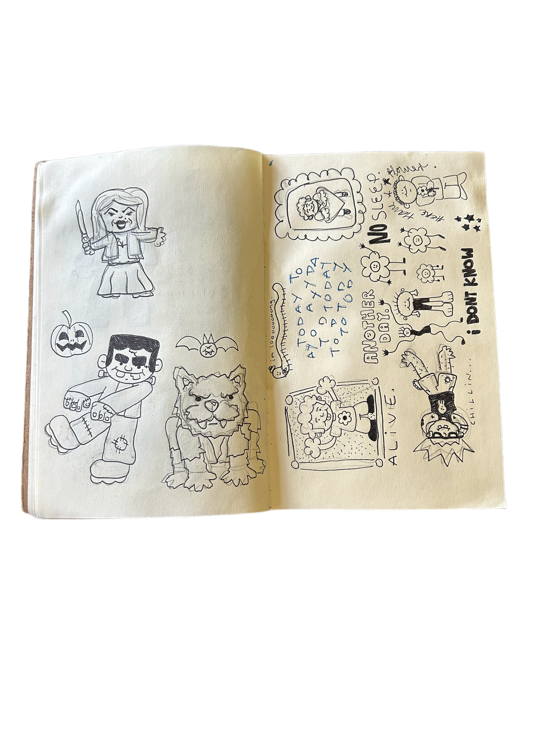 «CUADERNO DE DIBUJO EXTRA GRANDE PARA VIDEO MUSICAL DE DIBUJANDO» – Acrílico, Plumón y Pluma en papel y cartón -2023