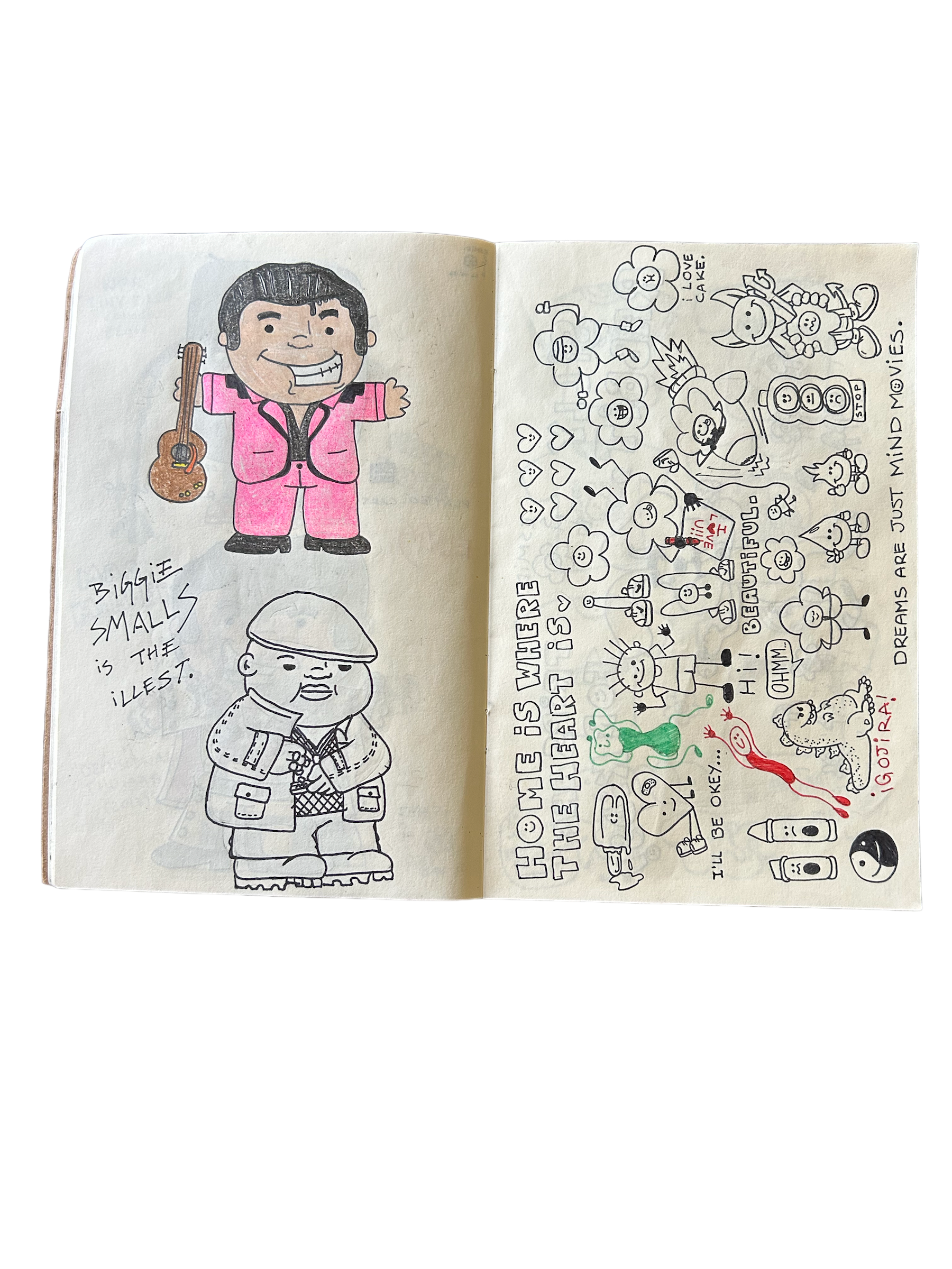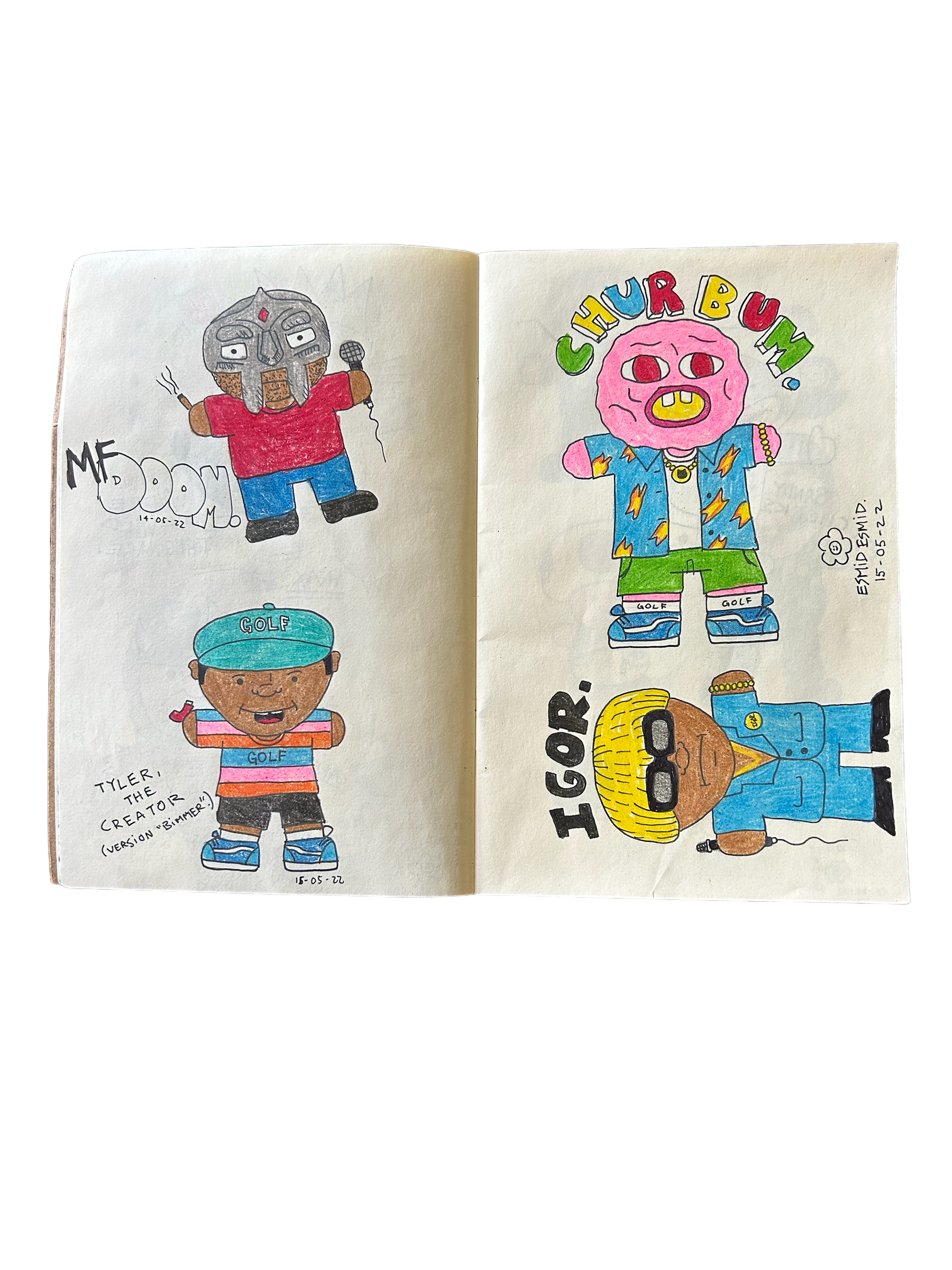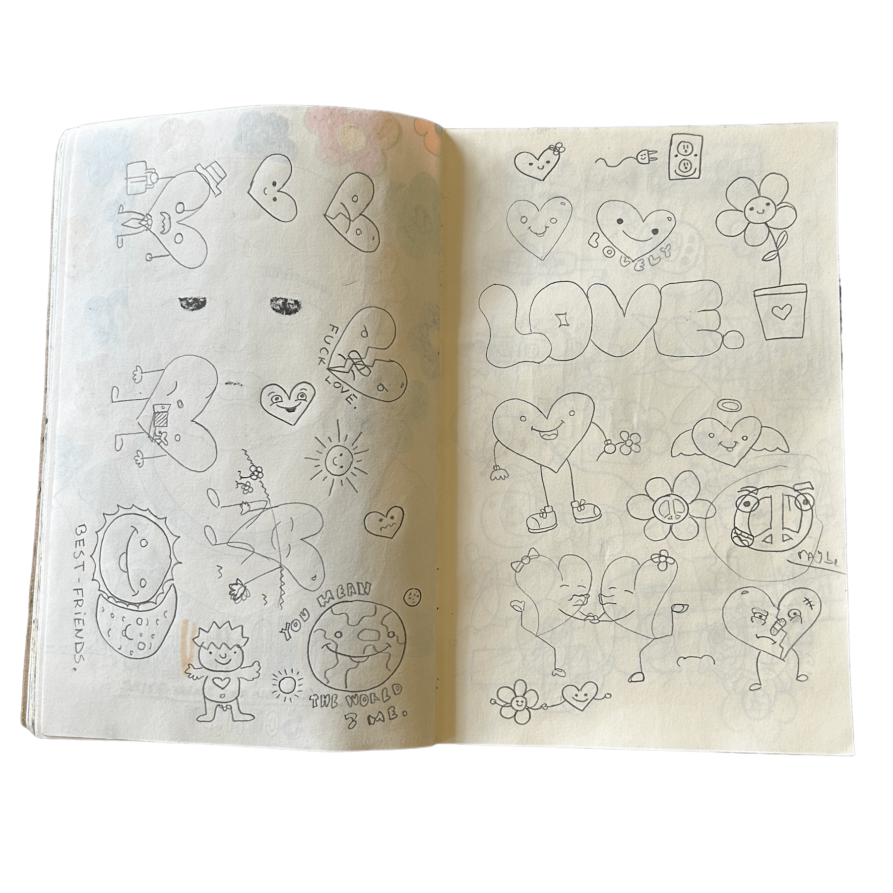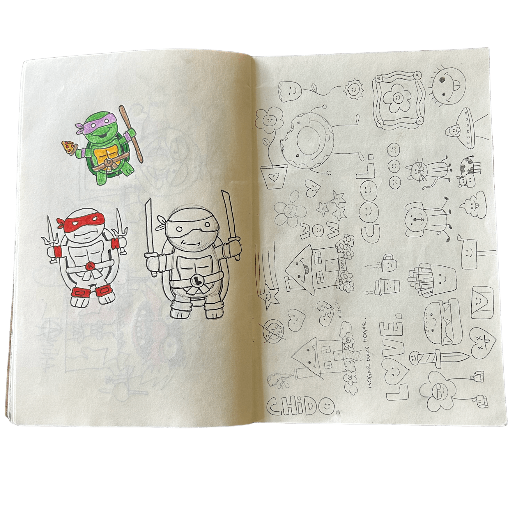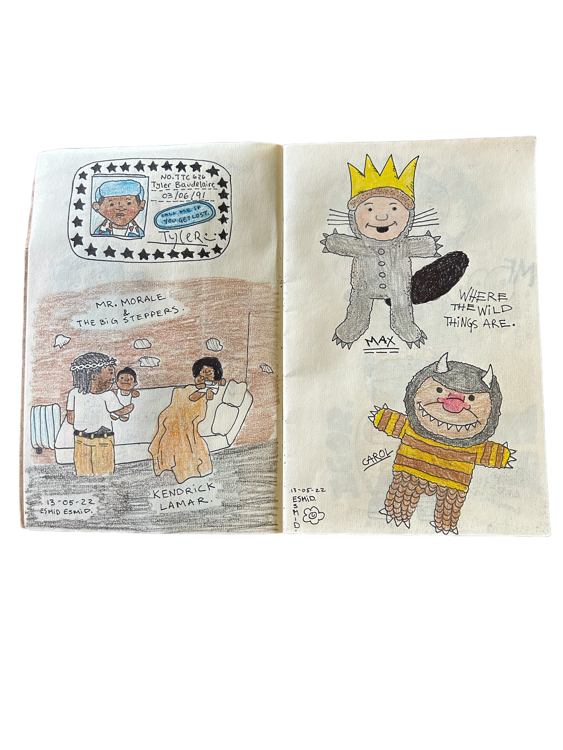 «CUADERNO DE DIBUJO EXTRA GRANDE PARA VIDEO MUSICAL DE DIBUJANDO» – Acrílico, Plumón y Pluma en papel y cartón -2023